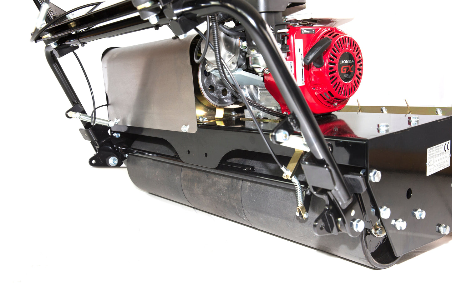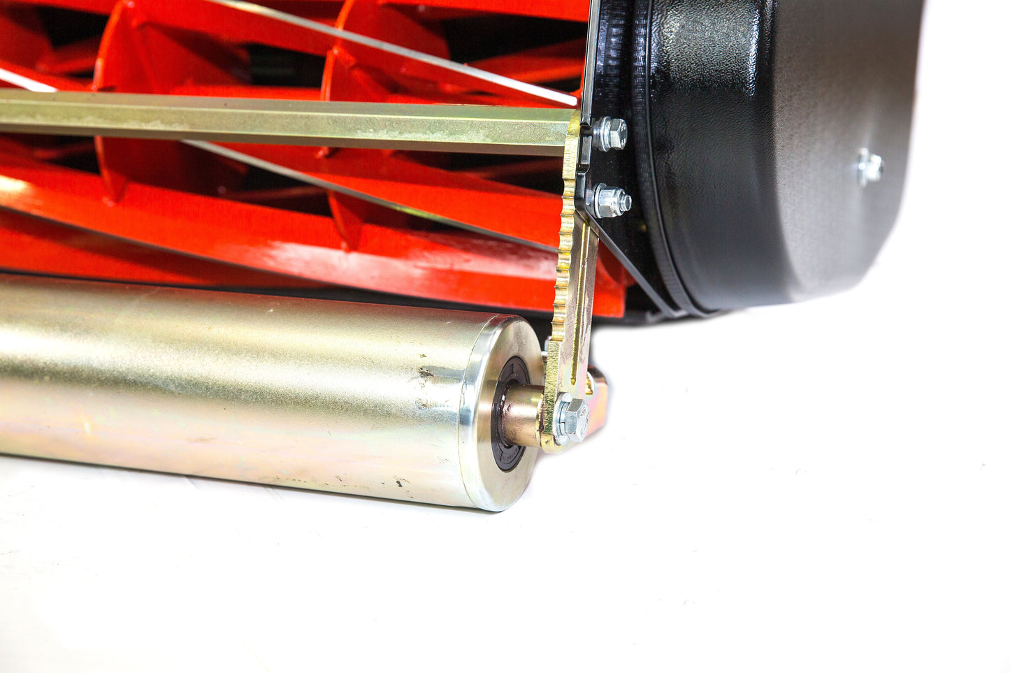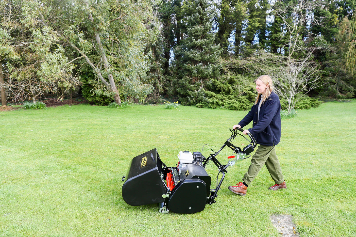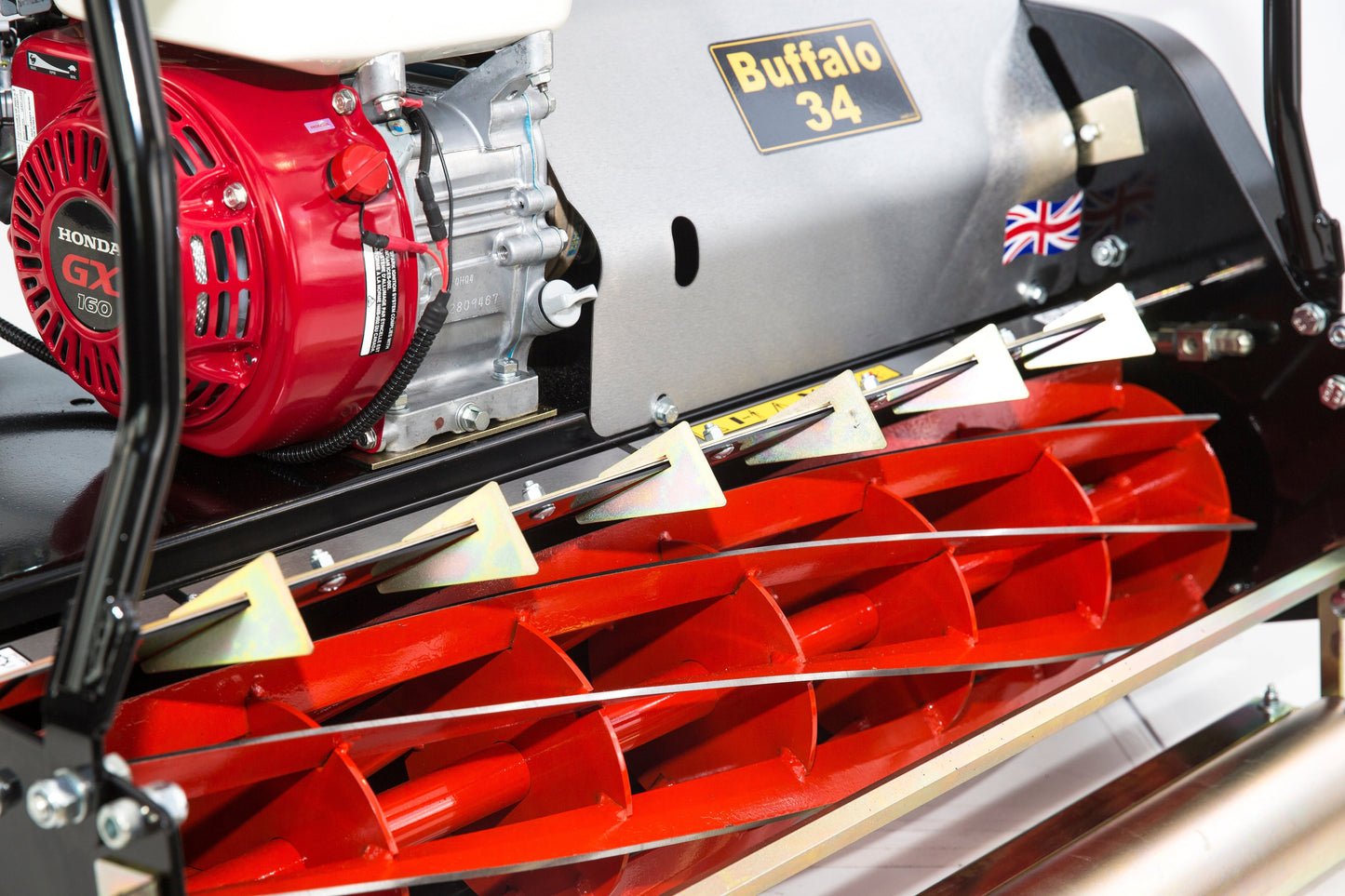 Wheel kit comprising two wheels and two anti-scalp rollers fitted in place of the rear roller and front roller respectively. The result is a rear-discharge cylinder mower capable of working in a wide range of grass lengths and conditions. Speed reduction kit. Optional trailing seat (Buffalo 34 only). Each mower’s cutting cylinder has a 200mm (8in) diameter with 8 blades, and an adjustable cutting height from 10mm-40mm.