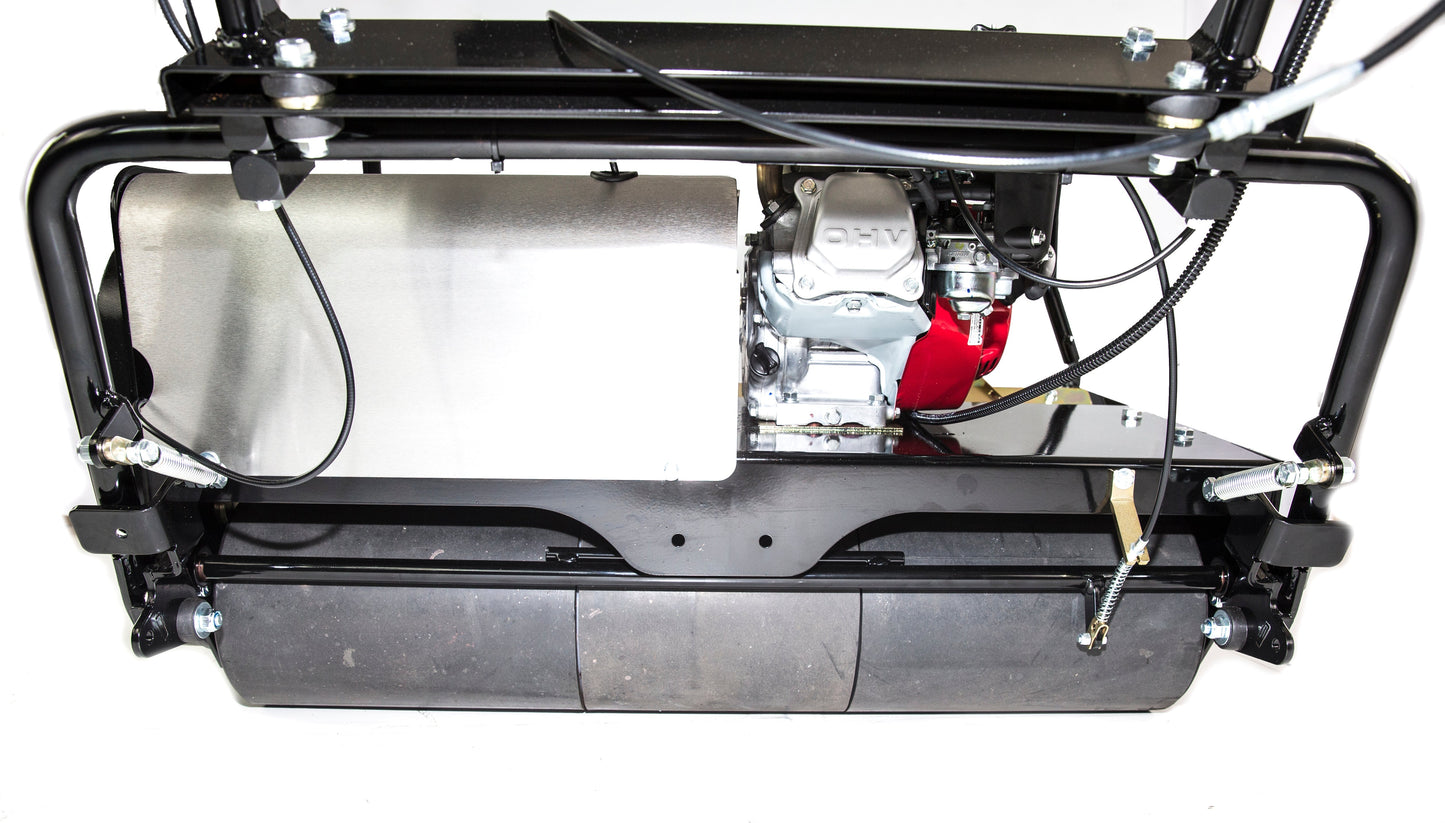 - Drive engagement Handle-mounted lever engaging V belt via cable