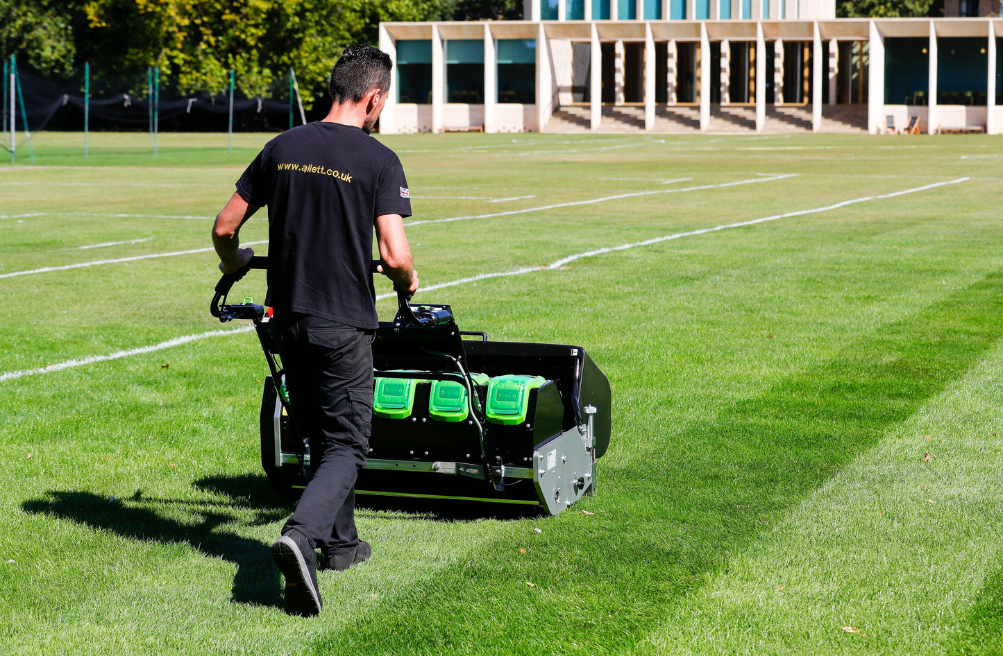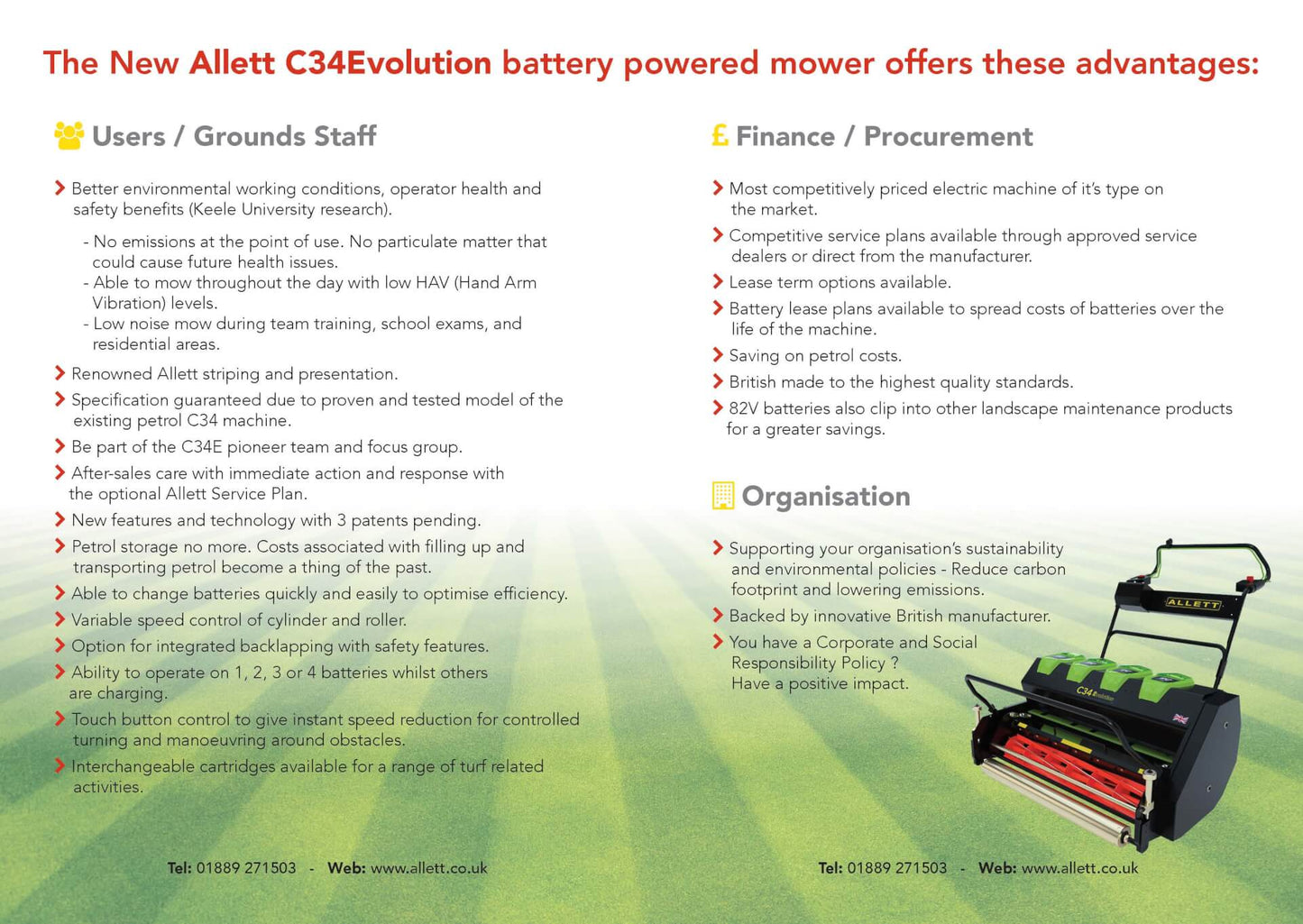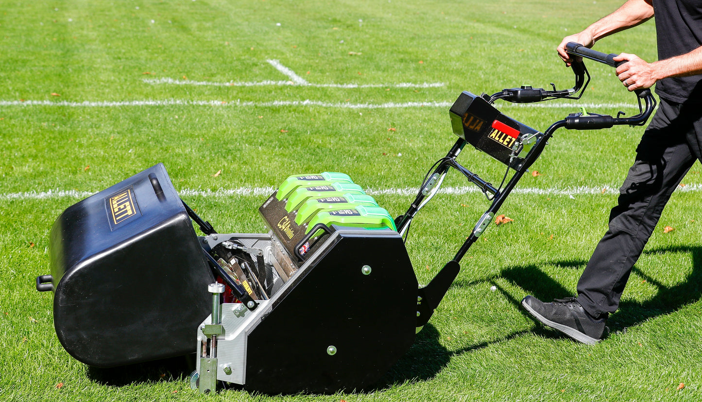 Allett powers into the new age of electric mowers with the C34 Evolution, the large area, walk-behind cylinder mower. The latest Lithium-Ion system battery technology drives the future of mowing systems for sports stadiums, training grounds and luxury lawns, without compromise and with all the attributes of the Allett heritage.