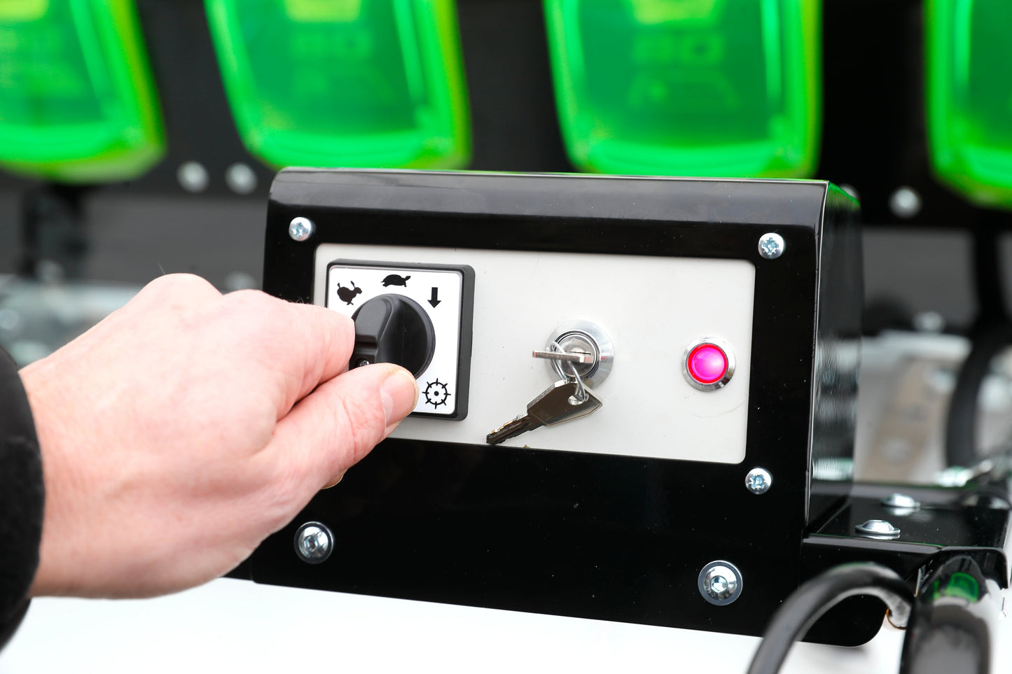 - Handlebar Wide handle bar, with turning control switch* for high productivity Touch button control gives an instant half-speed reduction for controlled turning and manoeuvring around obstacles- Half speed button (Patent No: GB 2 578 585)