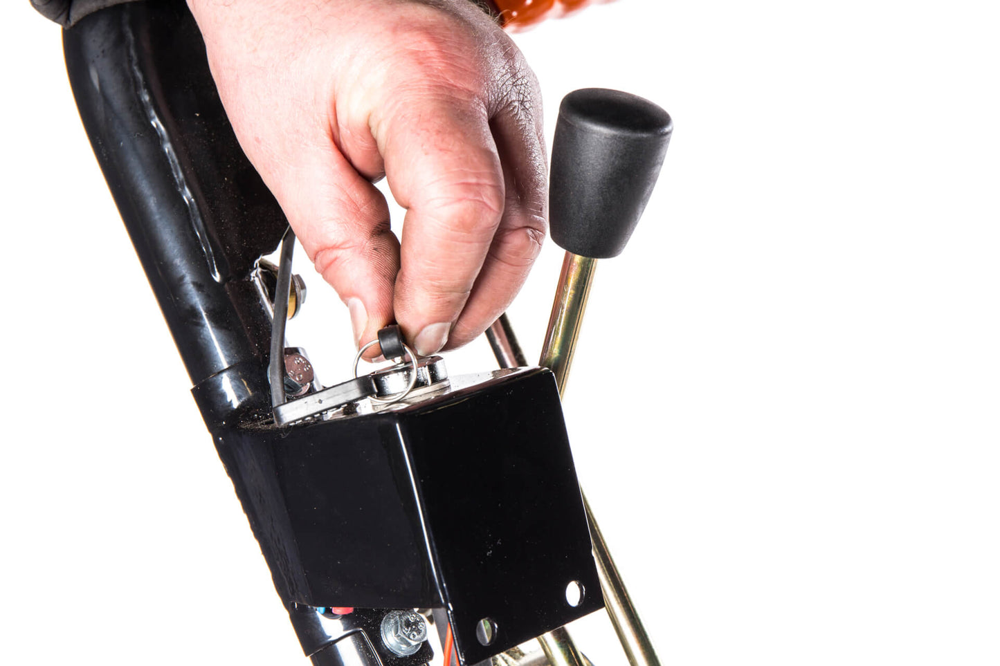 - Cylinder engagement Handle-mounted lever engaging triple V belts via rods